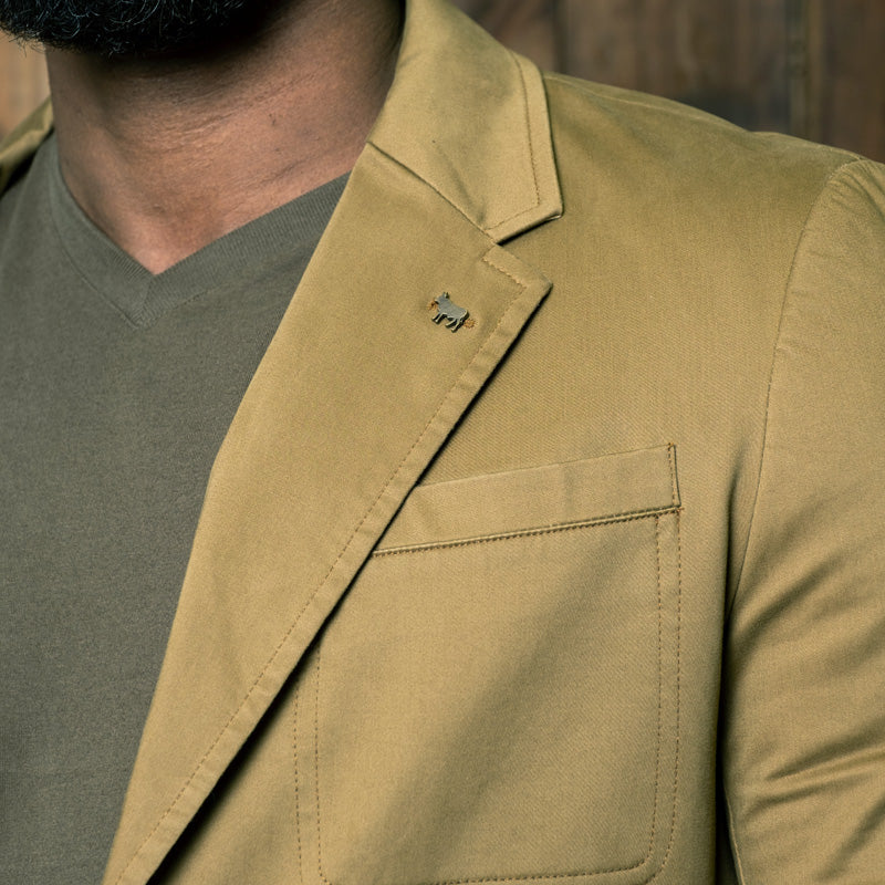 The distinctive antique brass nguni pin on the lapel and branded wood-look buttons add a touch of character and refinement to this already exquisite garment. Embrace the essence of luxury and style with the Kingsley Heath Urban Twill Blazer - because true elegance is always in fashion.