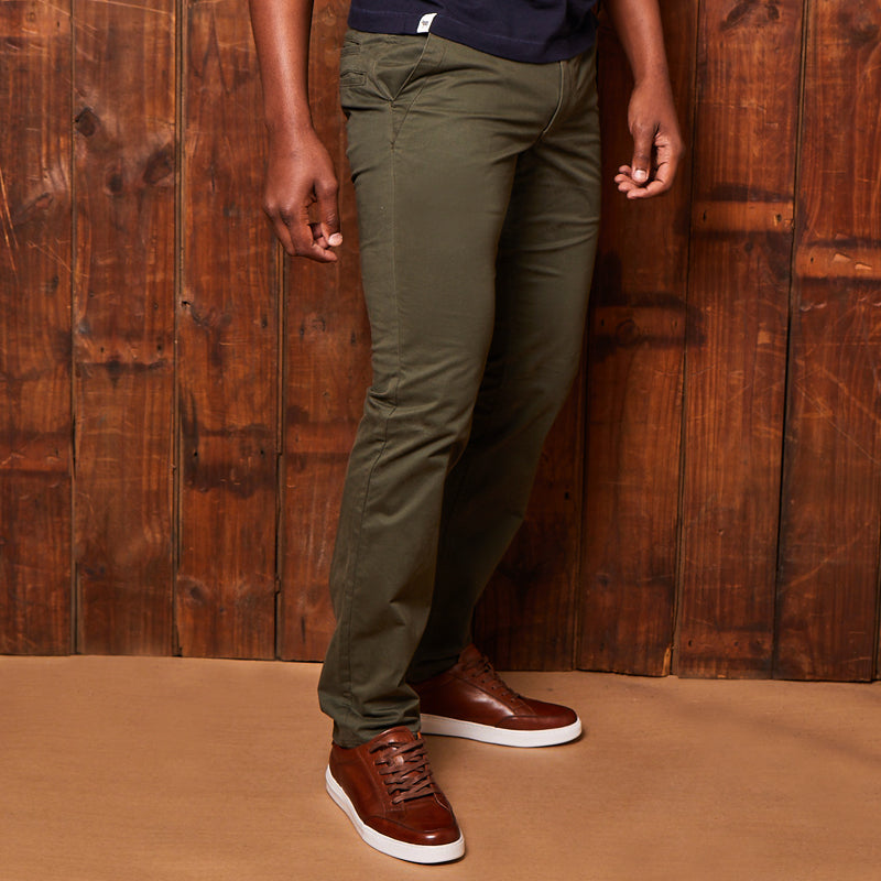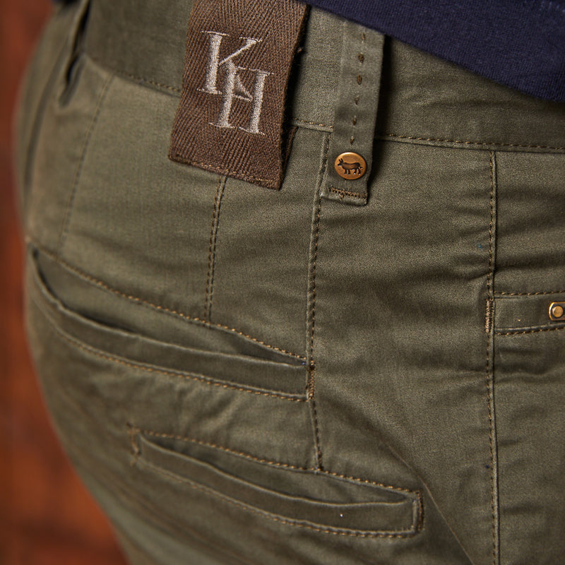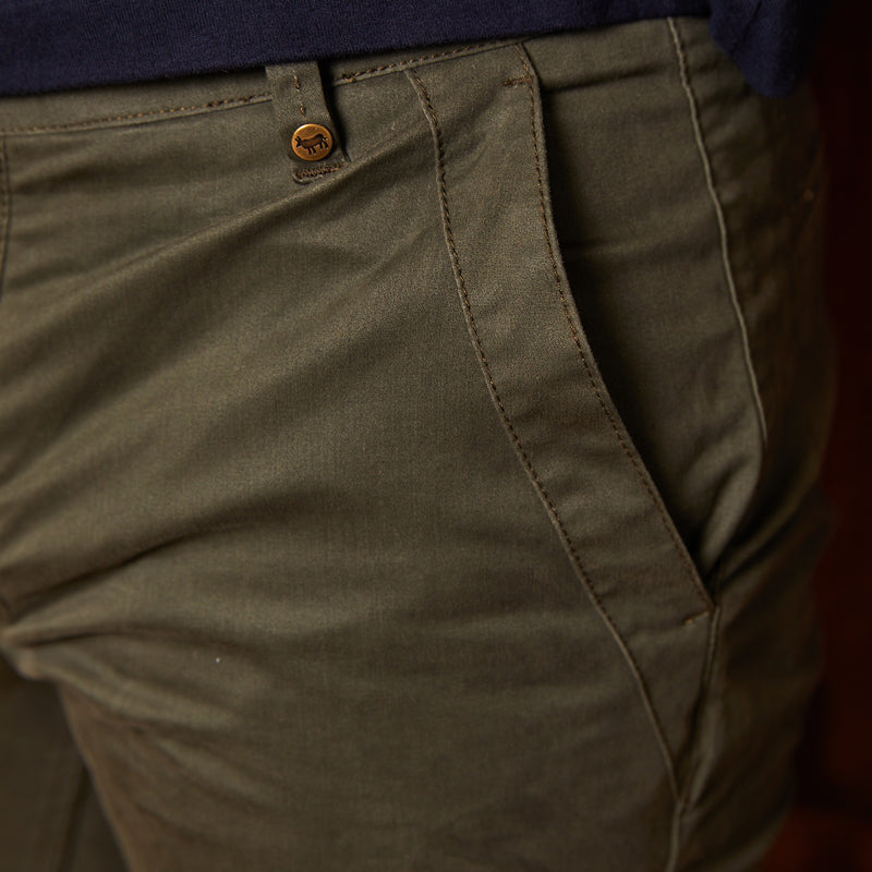 The Kingsley Heath Sabi Sands Chino has been developed for the larger framed individual, with more room in the legs while maintaining a slim fit. Crafted in a bespoke, incredibly dense and durable twill fabric. Just like previous fabrics we've used, this version has a solid 10 ounce weight and an impossibly dense weave. At first touch you feel the pure luxury. The almost peach-like surface is one of the softest we've experienced. Putting these Sabi's on is where the transformation happens. A touch of stretch makes this otherwise rugged fabric into one that moves freely offering you complete all day comfort. Packed with details like the branded pocket linings and featuring an indestructible YKK fly and embroidery, this is a must have staple in any wardrobe.