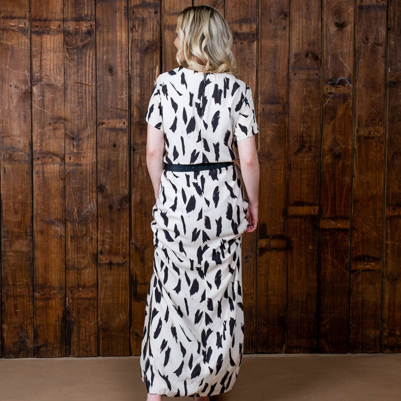 Our latest African Paint-strokes Maxi dress boasts a timeless, monochromatic print in the softest rayon fabric and can be perfectly paired with our luxurious leather sandals for a classic, feminine look.