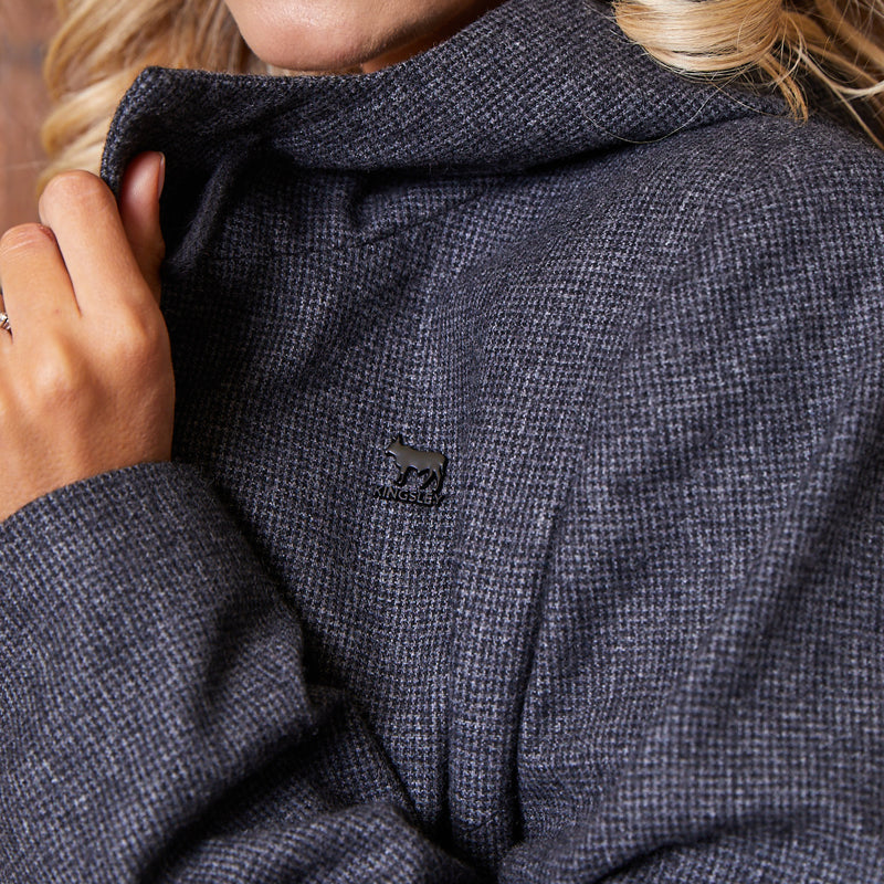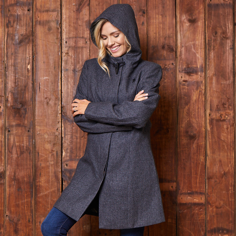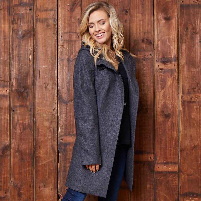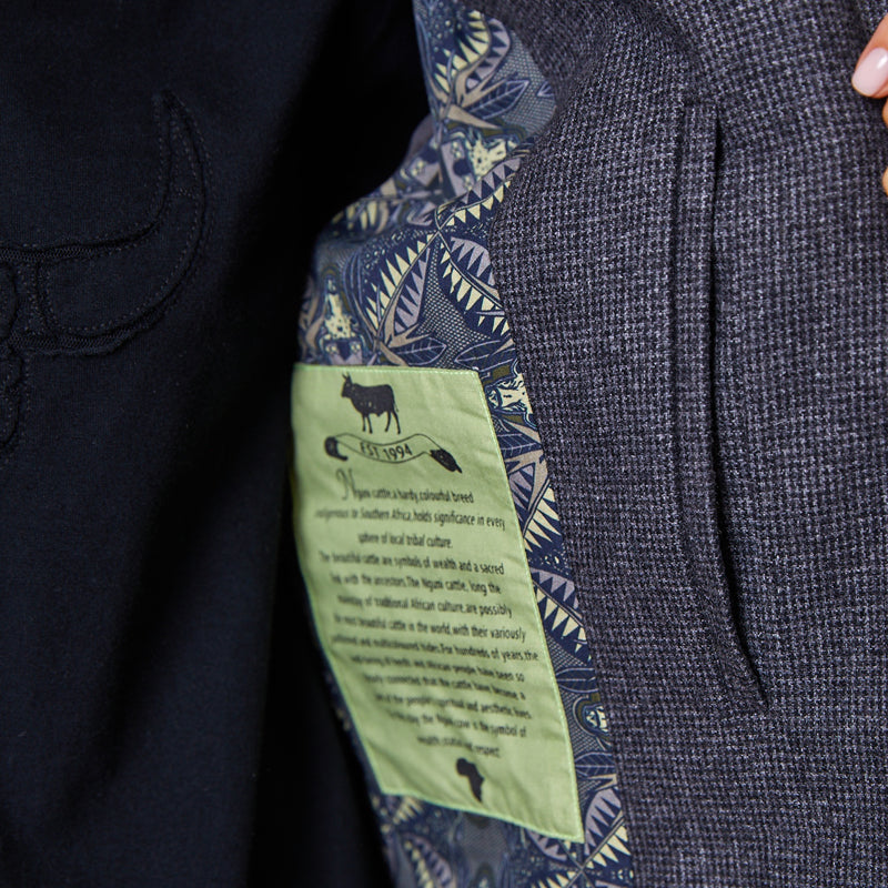 Layer up this Winter in our Classic Luxe Wool Coat. This luxurious houndstooth wool coat boasts a clean, flattering fit and minimalistic look, with a concealed placket over branded woodlook buttons. It is finished off with a horn buckle at the collar, subtle Kingsley branded trims, as well a unique Basotho inspired lining. A perfect layering item that can be worn over your favourite Kingsley knit or sweater, and skinny jeans.