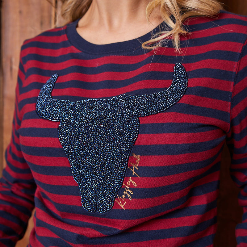 Our KH Embellished Skull Striped long-sleeve tee boasts a hand-embellished, beaded skull on a yarn-dyed striped base. Our long-sleeve tee features a flattering, feminine fit and is crafted from luxuriously peached 100% cotton. This style can be paired perfectly with our skinny jeans and your favourite Kingsley jacket for a perfectly stylish winter look.