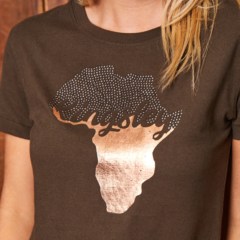 The 2 Tone Africa tee features a contrast metallic nail-head and foil print Africa for added surface interest and luxe. Update your Kingsley tee collection with this unique graphic tee. Our signature t-shirts are crafted from the finest, 100% cotton with luxurious peached hand-feel, for long-lasting comfort and durability. Our t-shirt collection is unique and versatile, promising you something for any occasion.