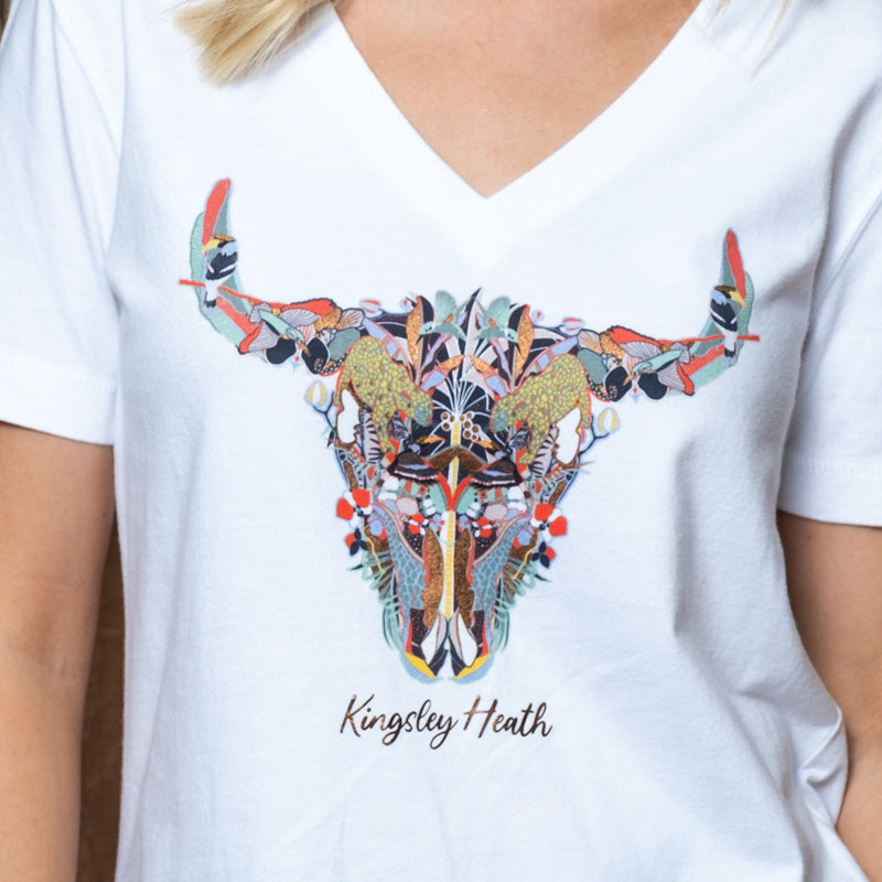 Our magnificent African Luxe Skull v-neck tee boasts a beautiful collage of our African indigenous fauna and flora. Flashes of seasonal colour pops and feminine foil prints add to the surface interest of these tees. Our t-shirt range is unique and crafted from the finest, 100% cotton with luxurious peached hand-feel, for long-lasting comfort and durability. These tees will give you years of enjoyment - as they will not lose their shape.
