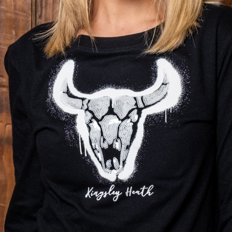 Add some grungy glitz to your outfit with this Graffiti Shadow Skull long-sleeve tee. These luxurious, peached tees are adorned with micro-sequins, to add some feminine texture. Layer these up under one of our iconic jackets for a cosy, winter look. Our t-shirt range is unique and crafted from the finest, 100% cotton with luxurious peached hand-feel, for long-lasting comfort and durability. These tees will give you years of enjoyment - as they will not lose their shape.