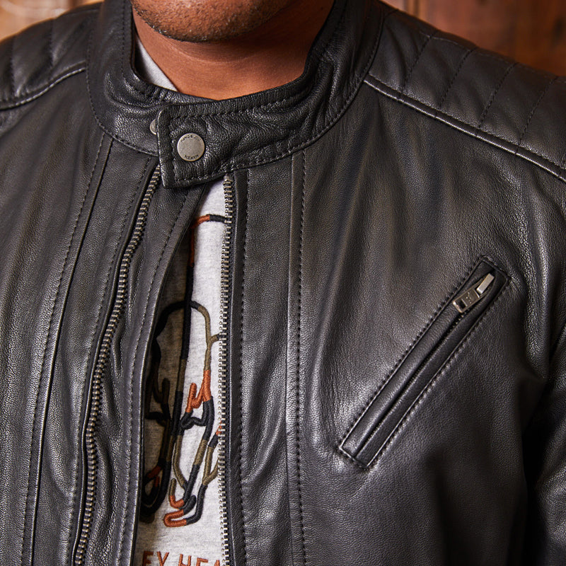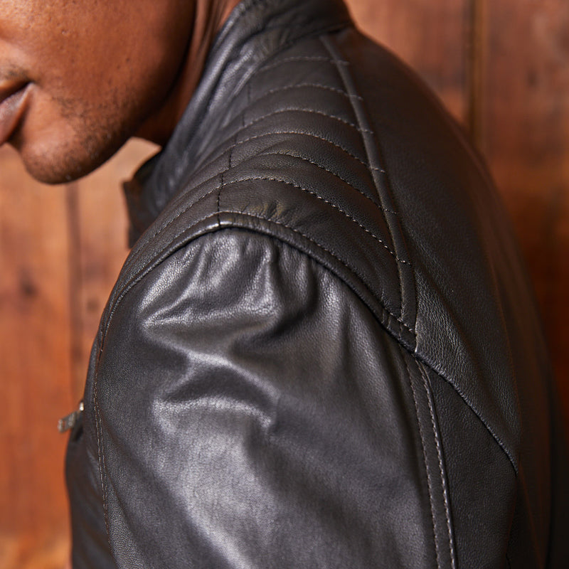 Our luxurious Chapman's Leather jacket is crafted from the softest, premium A-grade goat leather, also known for it's light weight and strength. The natural properties of this leather mean that it is water resistant, very supple and soft. We also tumble our leather to achieve a luxurious yet worn-in, matte-finish. Our leather is carefully selected for its buttery handfeel that is made to age beautifully and specifically chosen to allow for ease of movement. We have updated the design aesthetics of this style with quilted shoulder panels, and angled YKK zips. We have also meticulously crafted unique branded metal hardware to complement these styles. These wardrobe investments will never date and can be styled up or down season after season.