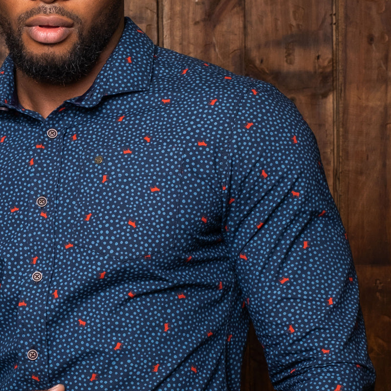 Our latest Slim Fit Shirts, boast fresh new designs and colours, and are must-haves for your Kingsley shirt collection. Worn styled up for work or casually for weekends, our men’s shirts are impeccably designed with the highest quality materials and detailing. Meticulously crafted from the finest, 100% cotton with peached handfeel, these shirts are made to last. The Paint Splosh shirt features a subtle, hand-rendered paint splosh print, whilst the Dotted Nguni shirt has a more vibrant, dotted Nguni print.